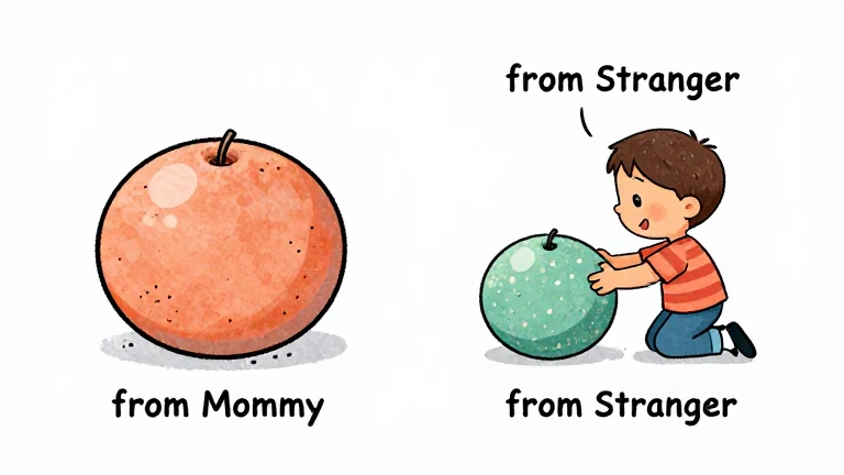 [IMAGE PROMPT: Illustration of a child shown two identical objects, one labeled “from Mommy” and the other “from Stranger,” child chooses the “from Mommy” item as more valuable, highlighting essentialist thinking, playful style, 16:9]